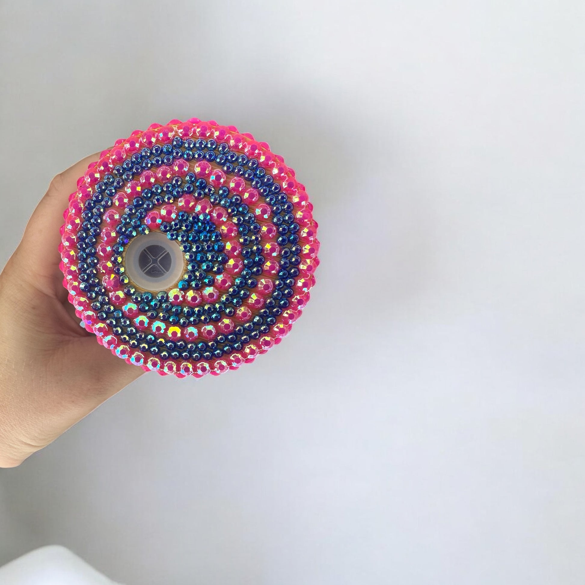 This 20oz glass tumbler comes with a natural bamboo lid that I’ve completely jazzed up with rhinestones in a spiral design of hot pink and electric blue.